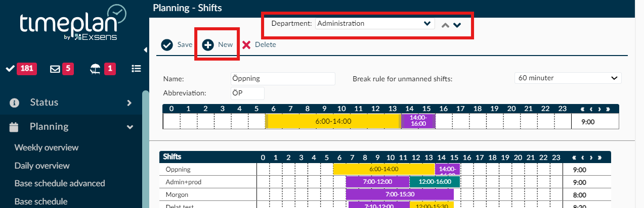 Press Planning and then Shifts. Then choose the department to place your work shifts in. Click on + New.