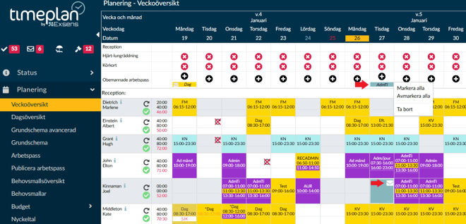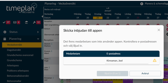 När en passförfrågan skickas till en medarbetare som ännu inte har aktiverat appen kan du som administratör skicka en inbjudan direkt via veckoöversikten.