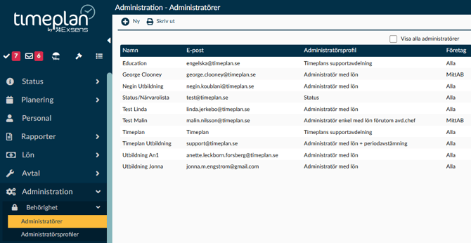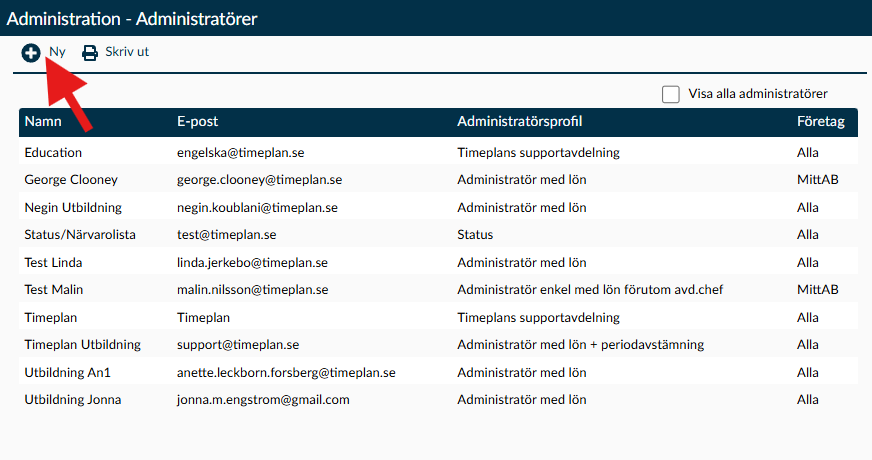 Gå via fliken Administration – Administratörer. Här ser du samtliga aktiva administratörer i er databas.