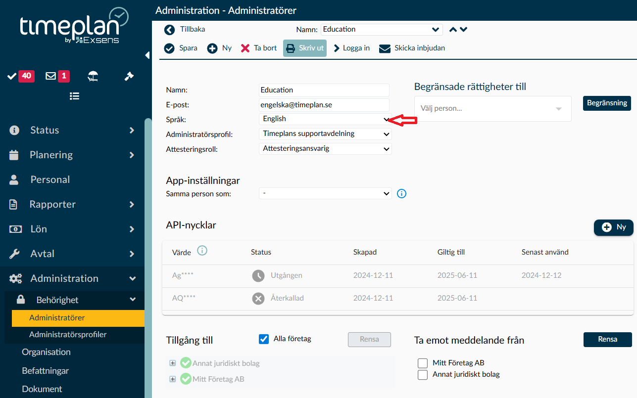 Språkval på administratörsprofil Välja språk på en administratörsprofil Gå till fliken Administration → Behörighet → Administratörer. Välj den användare du vill ändra. Under Språk, klicka på rullistan och välj önskat språk.