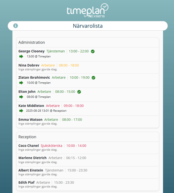 Här kan man se närvaro/frånvaro på anställda på den/de arbetsuppgifter man tillhör: