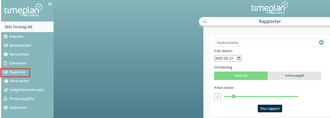 Välj tidsperiod, från-datum och vilken typ av rapport du önskar. Tänk på att veckoöversikten inte visar delade pass utan endast start- och sluttid.