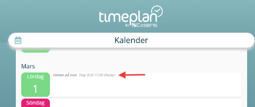 Du ser enkelt och tydligt vad du har svarat på en förfrågan då arbetspasset lägger sig som Väntar på svar i din kalender på aktuell dag: