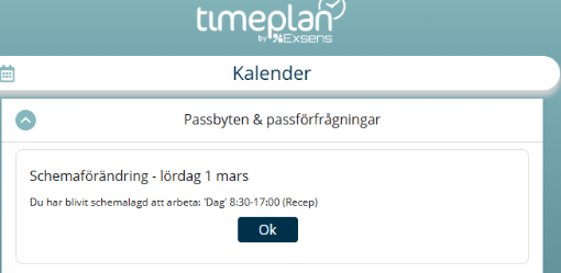 I det fall byte är möjligt och mottagaren svarar Ja, samt om bytet godkänns av chef så läggs passet automatiskt in i kalendrarna och en bekräftelse skickas ut till båda parter.