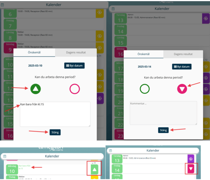 Klicka på aktuell dag i kalendern för att lägga in jag kan arbeta (markeras med grön symbol. Här kan du även lägga in kommentarer) eller jag kan inte arbeta (markeras med röd symbol) alternativt rensa önskemål.