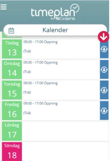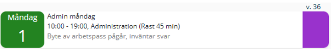Symbolen för byte av arbetspass ligger till höger på de dagar då arbetspass finns schemalagda. För att byta eller ge bort arbetspass klickar man på denna symbol:
