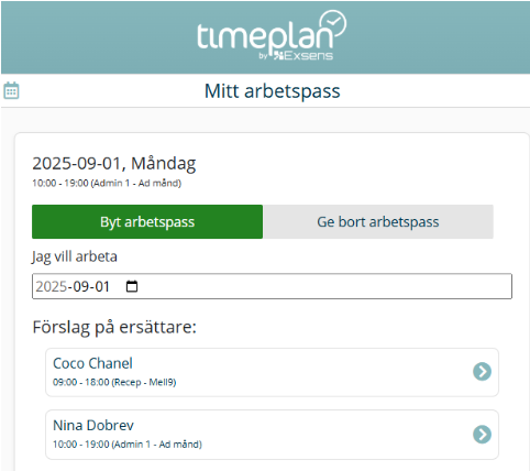 En lista kommer upp med förslag på de medarbetare som är tillgängliga för byte inom samma arbetsuppgift som du själv: