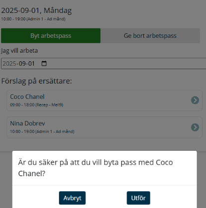 Klicka på den person du önskar byta pass med och klicka på Utför: